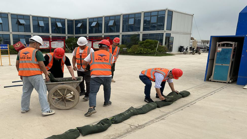 當天下午15時,雨勢逐漸加大,氣象局將臺風預警信號升級為橙色。面對險情,項目部啟動了防臺風橙色應急預案,各小組按預案分工,立即展開應急響應工作,對現場及危險區域進行警戒;所有人員安全撤離至安置點;重要物資及資料開始轉移;對基坑周邊低洼地帶,堆砌沙袋,防止雨水倒灌......