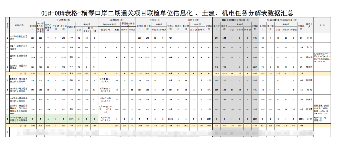 八是清單銷項。口岸指揮部延續“5+2”、“白+黑”的工作模式,解決現場推進過程中遇到的實際問題,確保問題不過夜。沖刺階段,更是堅持每天下午17:00組織參建單位召開工作協調推進會,重點梳理土建工程、信息化工程剩余工作推進情況、材料設備到場情況、質量問題整改情況等,形成8份銷項表,包括粵方海關、粵方邊檢、澳方海關、澳方邊檢、澳方衛生局等需協調解決的問題,實行“問題清單銷項督辦”的機制,要求各責任人“鎖定需求、對表作戰,對照銷項”。據統計,梳理大小問題多達3000余項。