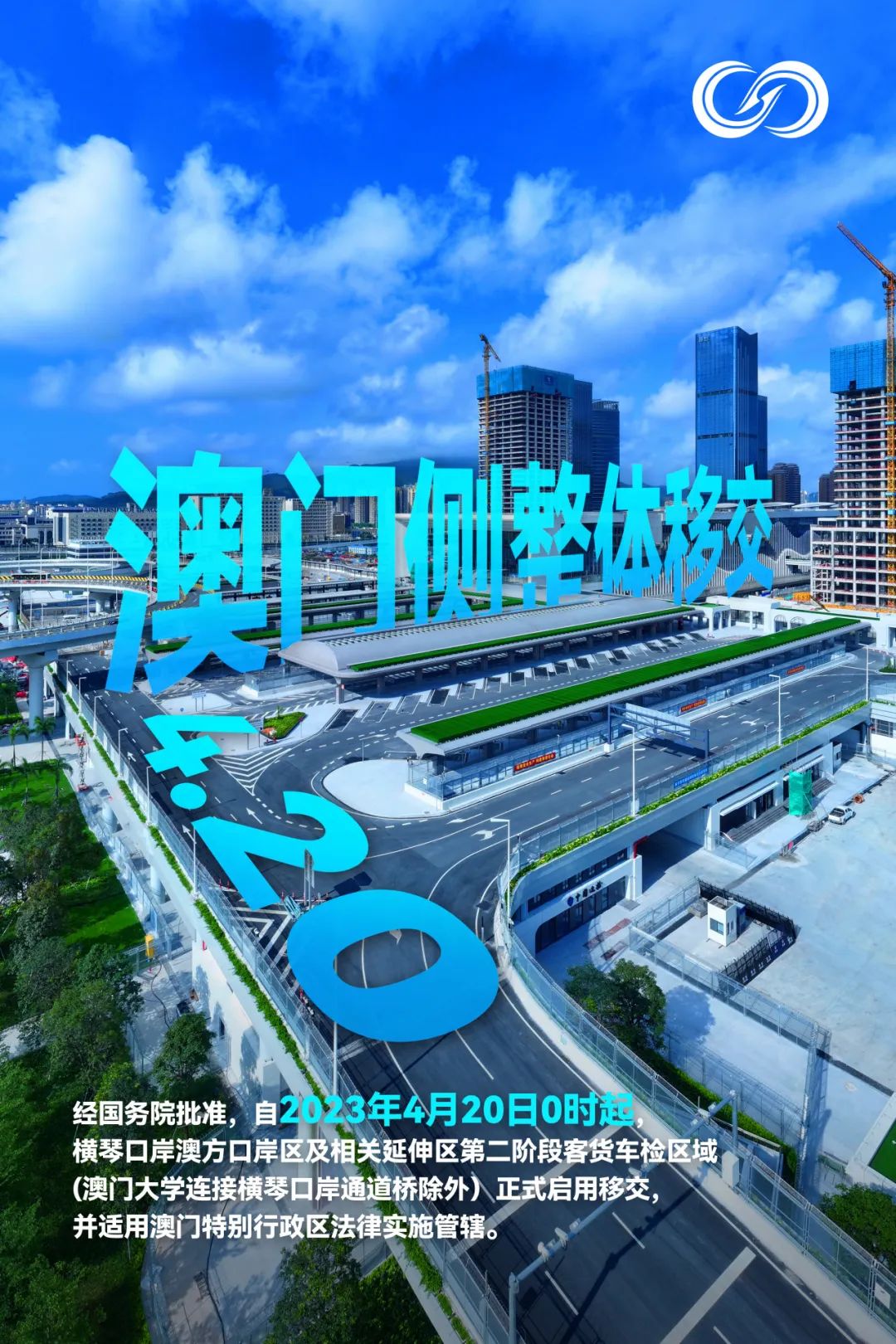 經國務院批準,自2023年4月20日0時起,橫琴口岸澳方口岸區及相關延伸區第二階段客貨車檢區域(澳門大學連接橫琴口岸通道橋除外)正式啟用移交,并適用澳門特別行政區法律實施管轄。