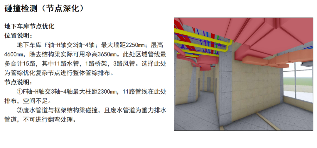 對(duì)綜合樓區(qū)域的機(jī)電模型進(jìn)行專(zhuān)業(yè)間的碰撞檢測(cè),導(dǎo)出碰撞檢測(cè)報(bào)告并進(jìn)行分析,結(jié)合圖紙會(huì)審結(jié)果,進(jìn)行機(jī)電管線(xiàn)綜合優(yōu)化。本次項(xiàng)目共優(yōu)化329余處,解決機(jī)電碰撞點(diǎn)329處,解決凈高問(wèn)題53處。