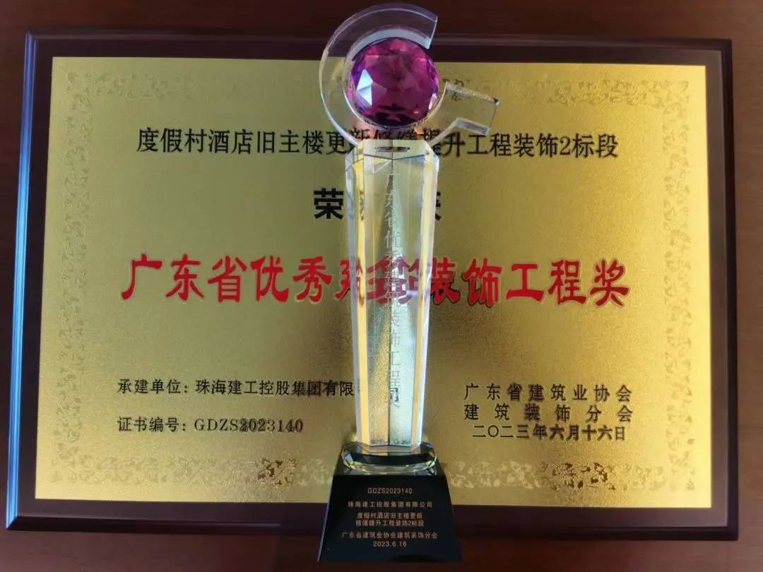 度假村酒店舊主樓更新修繕提升工程裝飾2標段榮獲全國建筑工程裝飾獎、廣東省優秀建筑裝飾工程獎、珠海市優秀建筑裝飾工程獎。