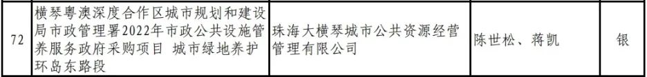 喜訊,2023年度,廣東省風景園林與生態景觀協會科學技術獎(園林工程獎)評選日前落幕,珠海大橫琴城市公共資源經營管理有限公司(以下簡稱大橫琴城資)管養的橫琴粵澳深度合作區城市規劃和建設局市政管理署2022年市政公共設施管養服務政府采購項目——城市綠地養護環島東路段榮獲養護類銀獎。